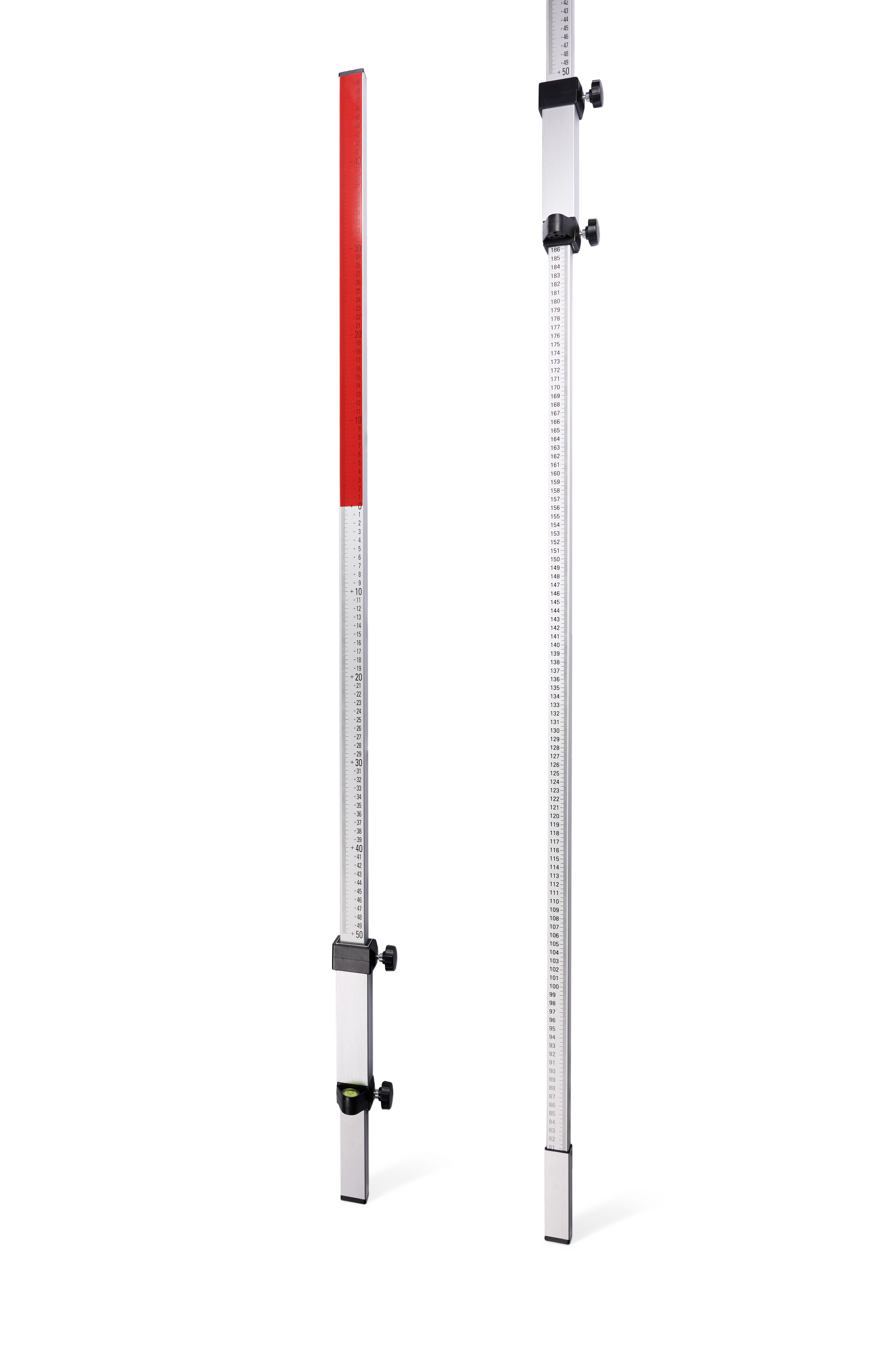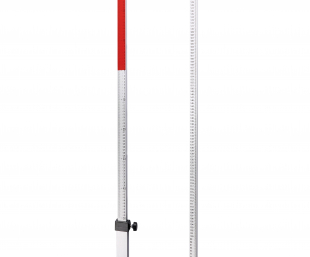 Нивелирная рейка разделена на две секции - нижнюю, на которой изображены цифры (общая высота до отметки "0" на верхней части рейки показана на нижней части рейки - это последняя цифра прямо под верхней секцией) и верхнюю с нулевой отметкой и отрицательной-красной шкалой и положительной шкалой для измерения превышений в миллиметрах относительно базовой точки.