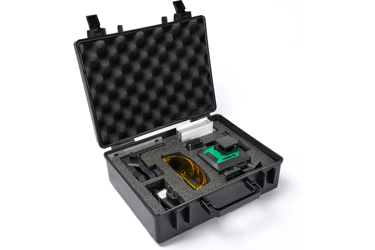 Прибор поставляется в эргономичном кейсе с рядом креплений, которые полностью покрывают потребности для установки/крепления уровня на необходимую высоту. Пульт ДУ сэкономит заряд аккумулятора без необходимости вручную отключать прибор.
