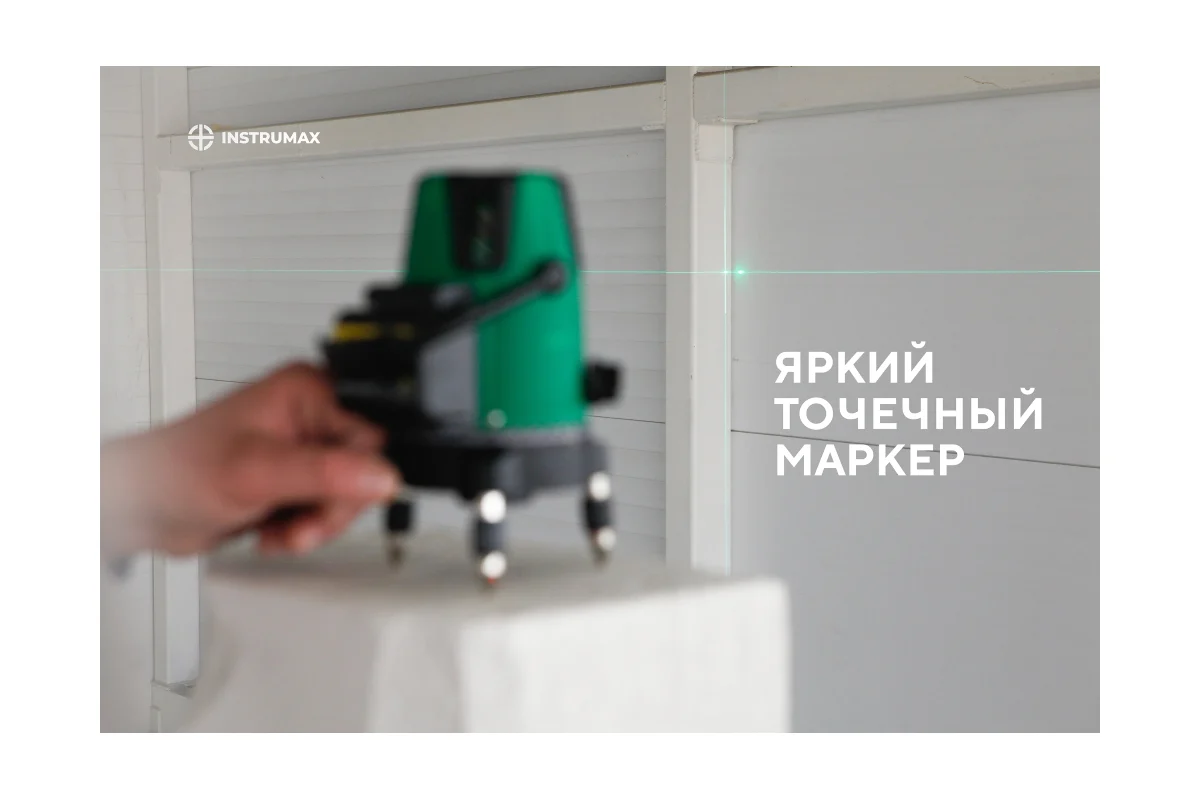 ЛАЗЕРНАЯ ТОЧКА. При ярком окружающем освещении или большом расстоянии лазерную линию почти не видно. Для разметки в таких условиях лазерная точка на горизонтальной линии позволяет выполнить работу. За счет вращения корпуса прибора лазерную точку можно легко перемещать по периметру и проверять горизонтальность.