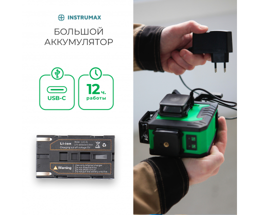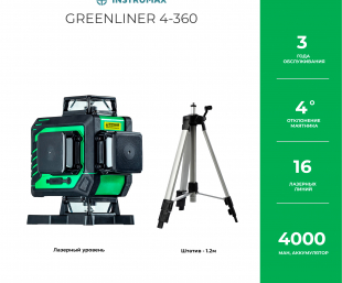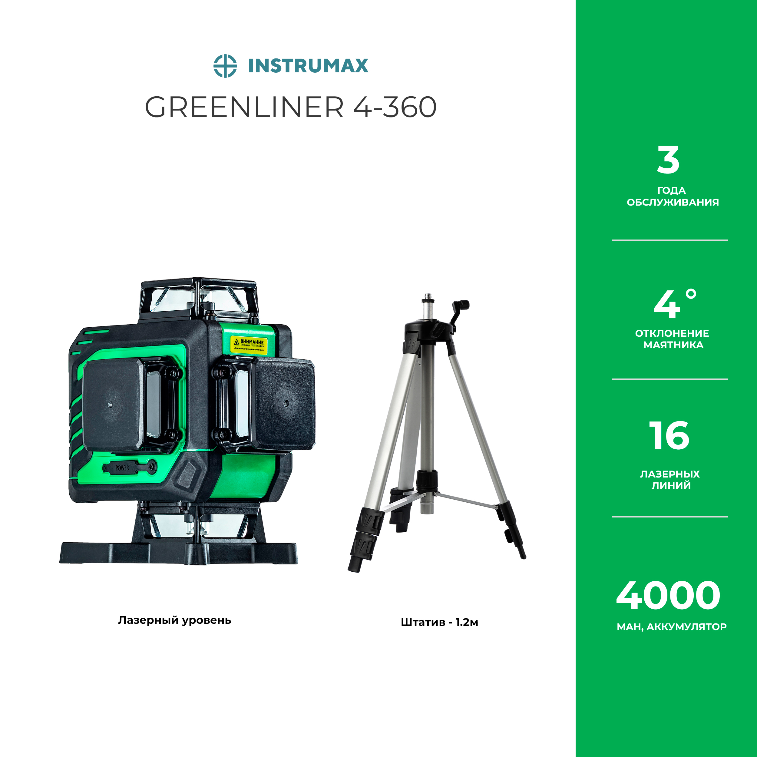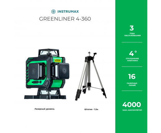Комплект Лазерный уровень INSTRUMAX GREENLINER 4-360+Штатив телескопический с резьбой 1/4 (5/8) дюйма INSTRUMAX TR-120