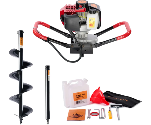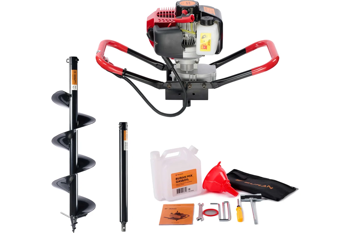 Мотобур поставляется с комплектом ключей для обслуживания, воронкой и мерной канистрой для смешивания масла с бензином. Посадочный вал имеет стандартизированный размер 20мм, может быть укомплектован соответствующими шнеками и аксессуарами, при этом производитель рекомендует обратить выбирать на обычные и усиленные шнеки BURAN с пожизненной гарантией.