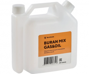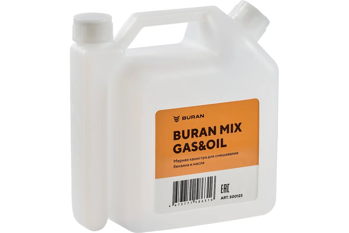 Мерная канистра для смешивания масла с бензином BURAN MIX GAS&OIL позволит точно и эффективно смешивать масло ибензин для двухтактных двигателей. Канистра имеет объём 1л и состоит издвух сообщающихся отделений: малого для масла ибольшого для бензина. Горловины для заливки раздельные. Наотделениях нанесена шкала вчастях. Намалом отделении канистры нанесено пять шкал, чтобы отмерить масло для приготовления топливно-масляной смеси вразличных соотношениях от25:1 до50:1.