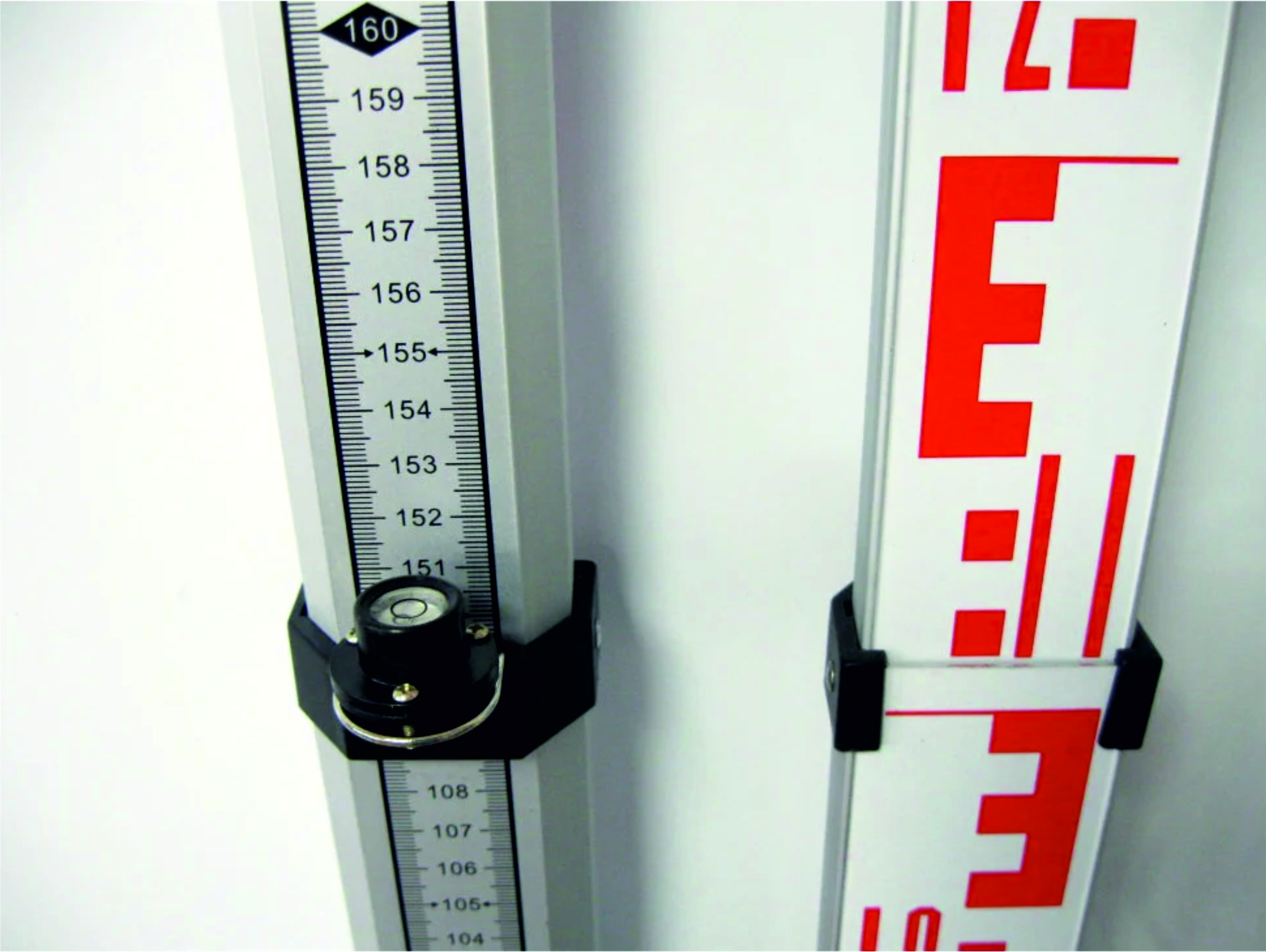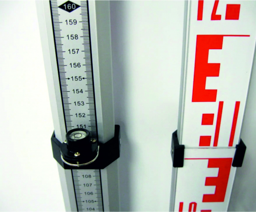 Шкала "Е" с лицевой стороны красно/черного цвета и миллиметровая шкала с оборотной стороны. Миллиметровая шкала начинает отсчет от нижней части рейки, шкала нанесена на всех 3-х секциях рейки снизу до верху. Общая максимальная высота в полностью разложенном состоянии составляет 3 метра.